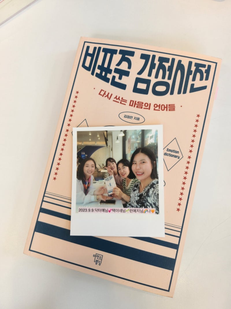 정은 작가의 독특한 언어와 솔직한 감성에 그림책의 매력을 더한 것을 경험할 수 있는 책. 함께하는 따뜻하고 포근한 시간을 선사하는 책. 저자만의 따뜻하고 섬세한 언어로 새롭게 정의된 감정을 담은 ‘비표준 감성사전’ 책. 당신의 감정을 읽고 이야기하고 싶습니까? 읽기해(Read it Do)는 자녀의 교육과 자기계발에 관심이 있는 엄마들의 독서모임입니다. 어제 드디어 총, 균, 쇠를 완독했고(다 읽어서 정말 뿌듯해요, 칭찬해주세요! ㅎㅎ) 김 작가님과 ‘비표준 감정사전’에 대한 북채팅을 할 예정이에요. 10월 첫 책을 내는 종운님, 작가님과의 북채팅에 이웃들을 초대하고 싶습니다. 초대하고 싶어서 글을 씁니다 하루 3줄 초등 글쓰기의 기적(윤희솔) 아버지의 해방 일기(정지아) 무기가 되는 이야기(도날드 밀러) 픽사 스토리텔링(맷 류) 재 – 최천 서재 칼 위트 교수법 이 책은 돈이다 돈 버는 방법에 대한 이야기(고명환) 세이노의 가르침 탄력성(김주환) 벌거벗은 한국사(인물편) 선김의 막을 수 없는 세계 사총과 세균, 그리고 리딧두잇에서 함께 읽는 쇠책들 비표준 감성사전 *리딧두잇 BOOK채팅 일시 : 10월 5일 목요일 오후 8시~9시30분 방법 : 비대면 줌북채팅 (링크보내드립니다) 이메일) 준비물 : 종이, 필기구, 책, 호기심+친절함 신청방법 : 비해설로 참석 여부를 알려주시면 사전 설문지를 보내드립니다. 참가비 : 무료 비표준감정사전 저자 김정 -은 출판마인드빌딩 2023.08.22 출시. 비표준 감성사전을 읽고, 김정은 작가님과 BOOK채팅을 해보세요 🙂 참여를 원하시는 분은 댓글 남겨주시면 정은 작가님이 보내주신 사전 설문지를 드려요. 책을 읽고, 사전 문항을 제출하고, 호기심과 친절함을 갖추고 10월 5일 목요일에 함께 해주세요. 거기서 보자. 화창한 가을날, 행복한 주말 보내세요.