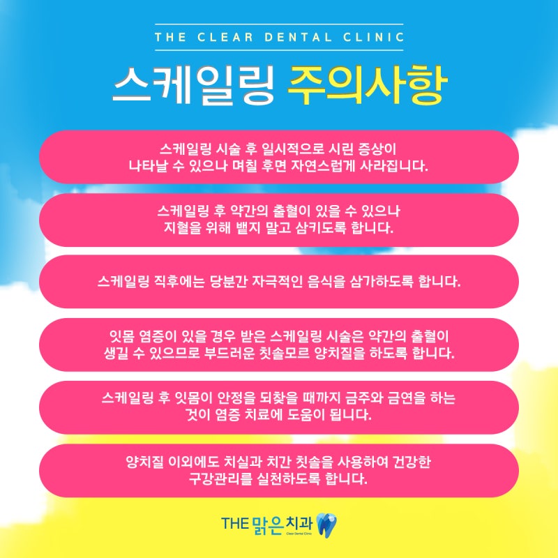 스케일링은 치석을 제거하는 방법으로 치석은 치아 표면에 달라붙어 접착력이 강해 치주질환을 유발할 수 있습니다. 스케일링이란 딱딱한 물질을 긁어내거나 비닐을 벗겨내는 것을 의미하며, 이를 정기적으로 하면 치주질환 예방에 도움이 될 수 있습니다.확장해야 하는 이유