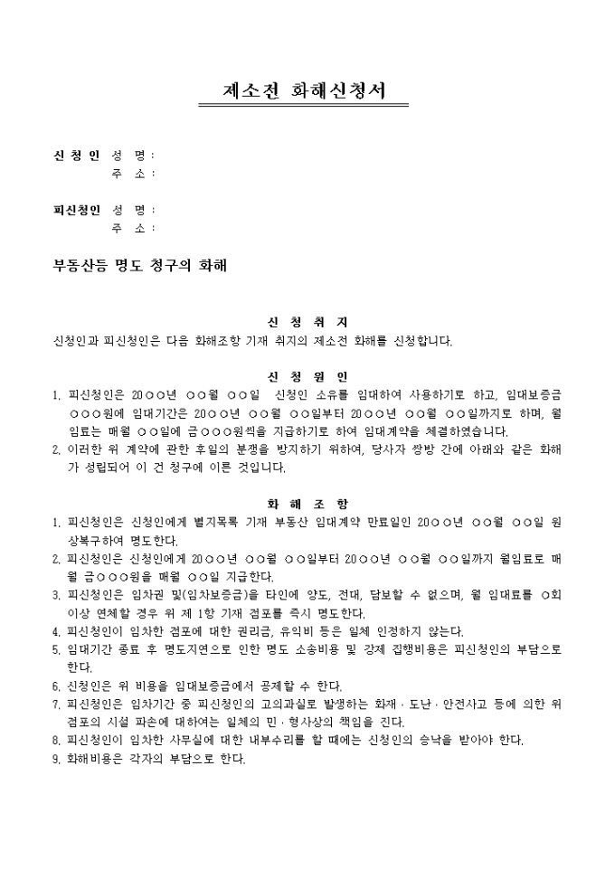 우선 소송을 제기하기 전 화해절차는 소송절차보다 간단하다. 임대인이 화해 신청서를 작성하여 법원에 제출하면 법원은 화해 기일을 잡습니다. 화해 의사를 표명하면 판사가 합의서를 작성해 집주인과 세입자에게 보내면 절차가 끝나기 때문에 훨씬 간단하다.