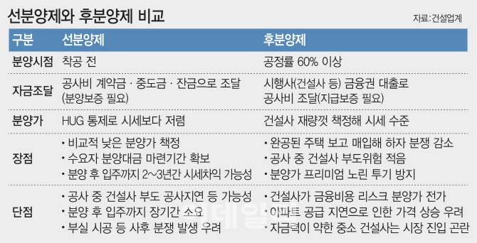 선분양제도와 후분양제도의 특징과 장단점을 알아보기 전, 먼저 개념을 정리해보자. 분양제도란 주택이 아직 완성되지 않은 상황에서 건설사나 사업자와 소비자가 계약을 체결하는 방식을 말한다. 한편, 사후분양제도란 계약하려는 주택의 건축이 80% 이상 진행되거나 완료된 후, 실제 매물을 직접 확인하고 계약을 진행할 수 있는 방식을 말한다. . 이에 건설사들은 자발적으로 두 가지 방식 중 하나를 선택했지만, 분양제도를 가장 선호하는 것으로 나타났다. 그러나 최근에는 시공 불량, 입주 지연, 모델하우스에서 본 샘플과 실제 상품의 차이 등의 문제가 많아 사후분양 제도를 선호하는 소비자가 늘어나고 있다.