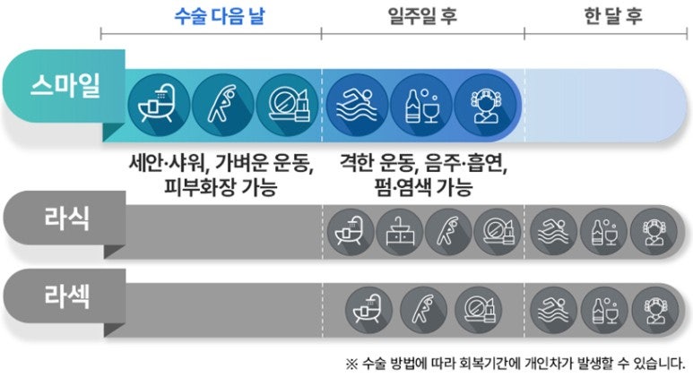 특별한 특징은 레이저가 각막 중앙에 발사된다는 것입니다. 동공은 각막의 중앙에 위치하지만 실제로는 정확히 각막의 중앙에 위치하지 않으며 사람마다 조금씩 다릅니다. 따라서 수술 시 동공 중심 방향으로 레이저를 조사할 경우 시력이 저하될 수 있으므로 동공을 따라가는 것이 아닌 각막 중심 방향으로 레이저를 조사하여 시력의 질을 향상시킵니다. 또한 Nunemiso는 레이저 조사 중에 개인의 각막 강성을 측정합니다. 강도를 조절하기로 했어요. 레이저의 세기가 너무 약한 경우 각막실질이 제대로 분리되지 않아 주변부에 찢어짐이 발생할 수 있습니다. 따라서 개인의 각막상태에 따라 레이저를 조절하여 부작용의 가능성을 줄였습니다. 또한, 근시를 교정하더라도 난시가 남아 있으면 선명한 시력을 기대하기 어렵습니다. 따라서 누네미소에서는 개인의 난시 축과 정도에 따른 절개 부위의 난시를 고려한 실질 분리와 기존 난시로 인해 약 2개월 이상 소요되는 번거로운 과정을 통해 시력의 질을 향상시킵니다. 방법을 생략하고 난시교정과 동시에 시행하였다. 개인의 눈 상태에 따라 시력교정수술을 통해 각막 손상을 줄이고 시력의 질을 향상시킬 수 있습니다. 3. 스마일안과의 맞춤형 SMILE 기법의 핵심