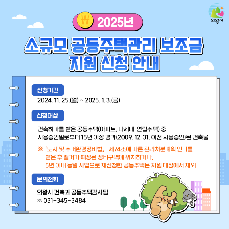 아파트 관리비 지원사업 안내 신청기간 – 2025. 1. 13.(월) ~ 2025. 2. 14.(금) 방문 또는 우편 신청 지원대상 – 승인일로부터 10년이 경과한 공동주택 사용(2014년 기준)(12월 31일 이전) – 지원받은 지 5년 미만인 공동주택은 제외됩니다. 지원범위 – 주택법에 따른 부대시설 복지시설 규정 및 주택건축기준 등에 따른 주민공용시설 교체 및 수리 – 아파트 공용부 유지보수(예: 옥상방수, 도장공사) – 수도관, 하수관 교체 및 수리 , 도로 등 공용 구역에 있습니다. 및 수리작업 신청방법 – 방문신청 및 우편신청 모두 가능합니다. (신청장소 : 건축과, 구건물 1층, 연천군청) 필수서류 첨부파일 지원사업 필수서류.hwp 파일 다운로드내로 저장 컴퓨터