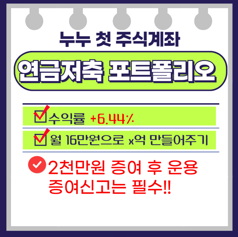 누누는 올해 2월에 태어났어요. 2천만원을 기부한 뒤 기부신고를 했고, 50%는 연금저축기금계좌로, 50%는 일반신탁계좌로 운영되고 있다. 아이의 경제적 자립을 위한 빠른 준비와 기반을 제공하기 위해 이미 아이의 첫 통장으로 여겨졌던 연금저축기금 계좌를 비자녀를 허용하는 증권사 중 매매수수료가 가장 낮은 증권사에 개설했습니다. 대면개설을 통해 총 4개의 ETF를 매입하였습니다. 현재 ETF는 3개만 남아있습니다. RISE US NASDAQ 100 40% RISE US S&P 500 15% TIGER 미국 배당금 Dow Jones 45% TIGER CD 금리투자 : 대기예금을 주차계좌처럼 구매하는 상품
