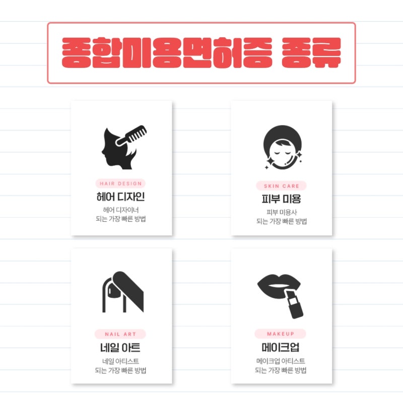요즘은 하나의 카테고리가 아닌 다양한 분야를 통합하는 추세입니다. 대표적으로 샵인숍(Shop-in-shop) 개념으로 구성하여 진행하였다. 뷰티와 관련된 자격증은 일반/피부/네일/메이크업 등 각 분야로 나누어져 있습니다. 종합미인 면허 취득 조건은 4가지 요건을 모두 갖추거나 관련 공고 1학년 과정을 이수한 것입니다. 또 다른 조건은 관련 대학 이상의 학력이 있어야 면허를 받을 수 있다는 점이다. 현재 상황에서는 대학을 다니다가 자퇴를 해서 고등학교 졸업장이 없습니다. 이것이 교육의 마지막 수준이었습니다. 라이센스를 하나씩 취득하는 것은 기술적인 측면에서는 좋았지만, 현실적으로는 부담이 되었고 업무 범위가 제한되어 있었습니다. 자격증별로 필기시험과 실기시험을 모두 통과해야 해서 시간이 오래 걸렸지만, 그럼에도 불구하고 많은 것을 융합할 수 있는 것이 제 목표였습니다. 권한이 주어졌다는 뜻이다. 나는 멘토에게 물었고 두 가지 효과적인 방법을 찾기 시작했습니다.