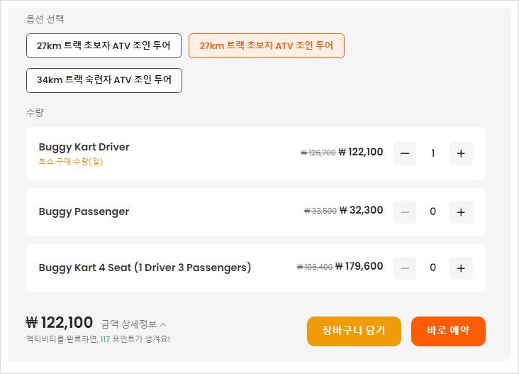 클룩과 KK데이 파타야 버기 가격은 환율이나 성수기 등 날짜에 따라 다소 변동될 수 있으나, 현재 파타야 버기 가격대 중 가장 대표적인 여행 액티비티 여행사이트인 클룩과 KK 데이의 가격을 비교해 보세요. . 살펴보면 다음과 같습니다. 클룩을 보면 27km, 34km 등 거리와 초보자인지 경험자인지에 따라 가격대가 천차만별이다. 초보자에게는 조금 더 쉽고 평탄한 코스이며, 전문가보다는 거리가 더 짧습니다. 숙련된 라이더의 경우 초보자보다 거리가 길고 코스도 다소 험난한(?) 부분이 있습니다. 클룩 초보자를 위한 27km를 달리는 파타야 버기카 가격은 얼마인가요? 운전자 1인의 비용은 약 122,000원이며, 승객 1명을 추가할 수 있습니다. 32,000원 정도였습니다. 4인의 경우 운전자 1명 + 승객 3명의 총 비용은 현재 179,000원 정도입니다. 파타야 ATV & 버기 어드벤처