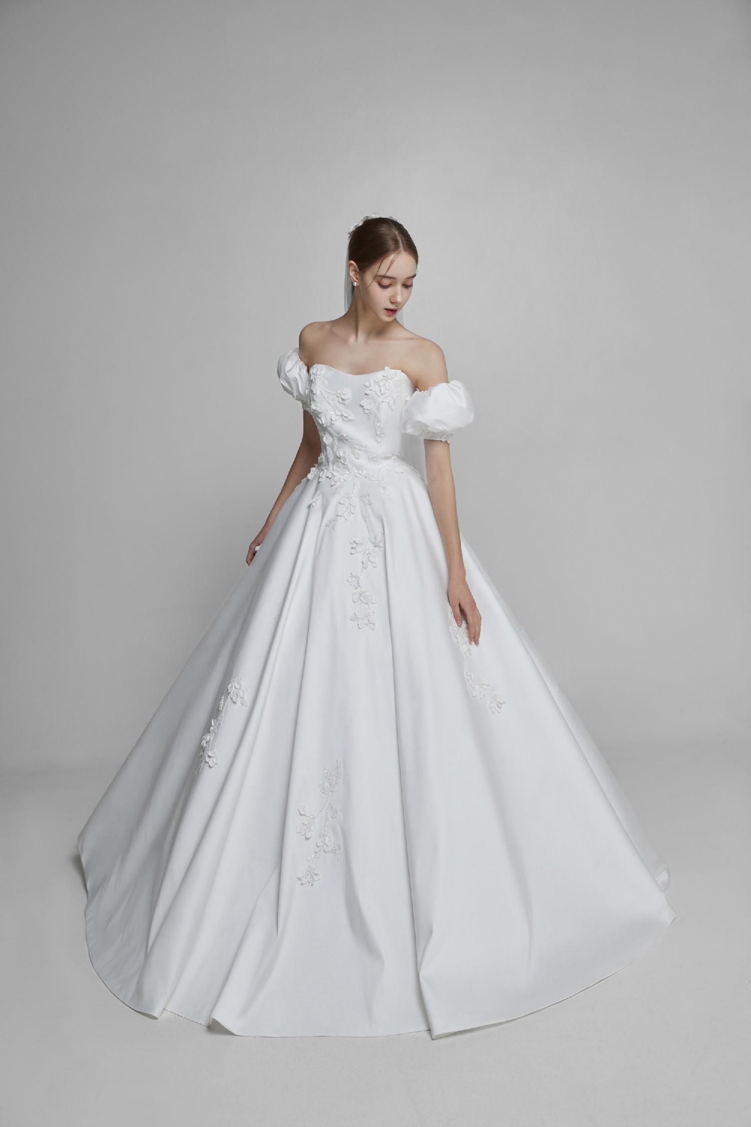 제가 가장 입어보고 싶었던 드레스가 바로 사진 속 드레스였어요. 24FW 컬렉션으로 출시된 드레스로 쿠튀르 라인, 즉 프리미엄 라인 드레스입니다. 드레스 이름은 ‘란티나’로 실제로 출시 이후 예복으로 큰 인기를 끌었다고 한다. 스태프에게 들은 바로는 얼짱으로 유명한 한아름송이 씨도 결혼식에 이 드레스를 입었다고 합니다. 풍성한 A라인 핏에 플라워 패턴이 새겨져 있어 실크 드레스 중에서도 살짝 화려한 느낌의 드레스입니다. 사진으로 봤을 때도 정말 예뻤는데, 실제로 입고 거울을 보자마자 감탄이 가득했어요. 아르하 드레스의 클래식하면서도 우아한 무드를 다른 브랜드에서는 따라올 수 없을 것 같아요.