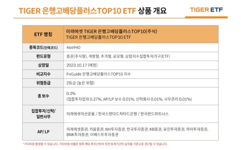 ○ 상장일 : 2023년 10월 17일 ○ 총순자산 : 1,081억 원 ○ 총 보상액 : 0.30% ○ 기본지수 : FnGuide Bank High Dividend Plus TOP 10 Index